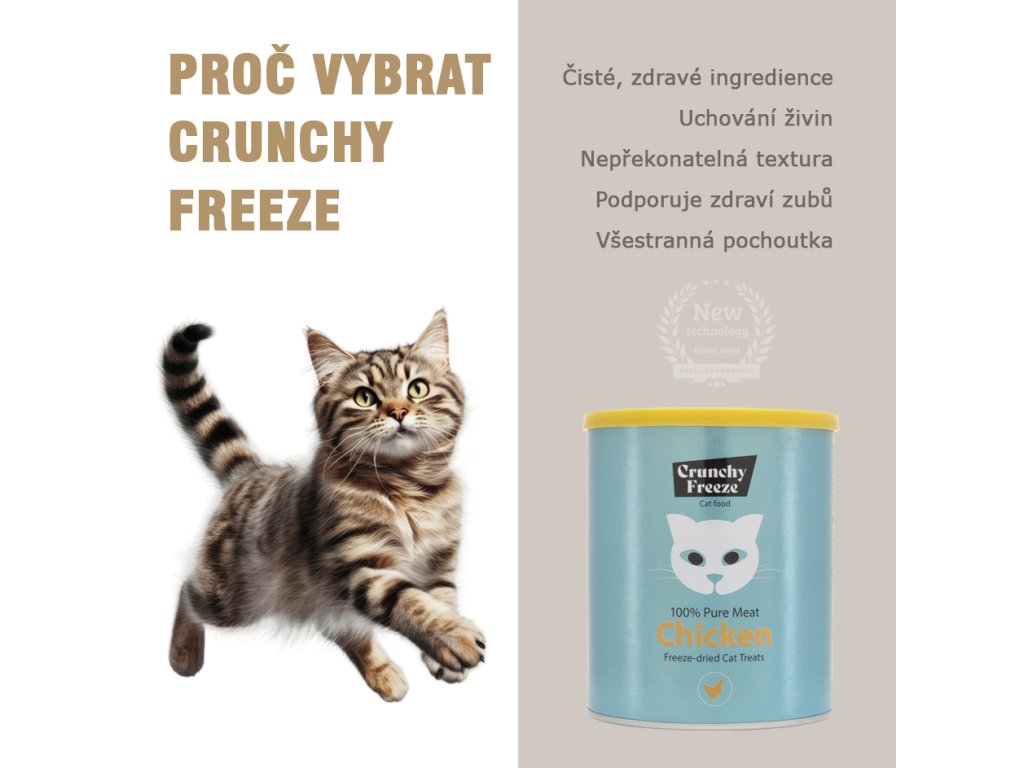 - Nepřekonatelná textura: Kočky milují ochutnat něco uspokojujícího a křupavého. S Crunchy Freeze každý sousto přináší lahodnou křupavost, která nechá vaši kočku spokojeně mrňavět.