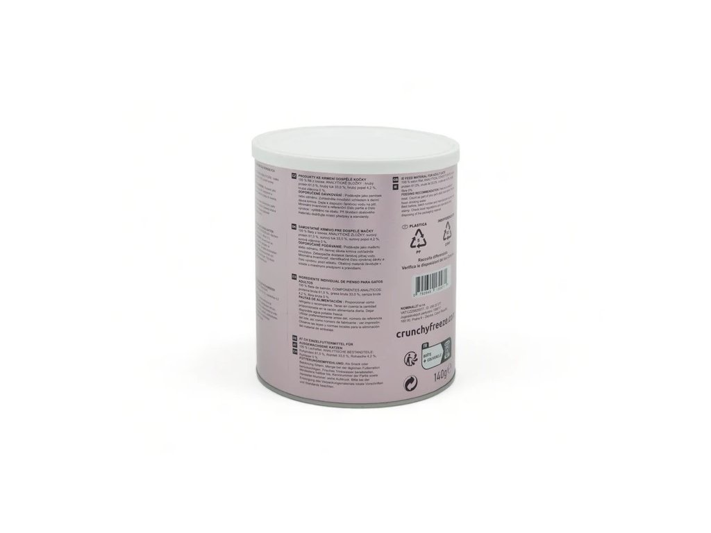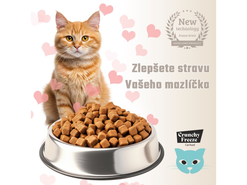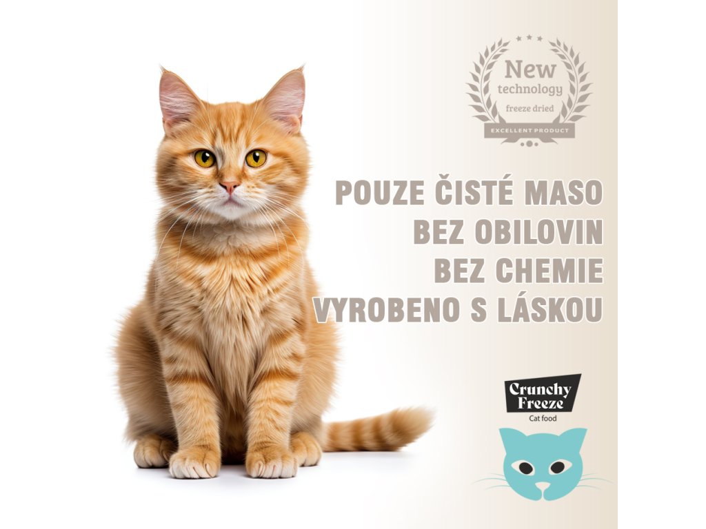 Uspokojte chuťové preference vaší kočky našimi vysoce kvalitními sušenými masovými dobrotami - Crunchy Freeze! Speciálně vyvinuté, aby uspokojily přirozené instinkty vašeho kočičího kamaráda, tato lahodná pochoutka je více než jen odměna – je to oslava chuti a výživy.